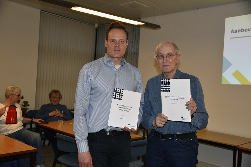 Op de foto: Renske Bult (beleidsmedewerker taal en cultuur van de gemeente Ooststellingwerf) ontvangt het rapport van onderzoeker Jeroen Zandberg (onderzoeker WB-NSC).
